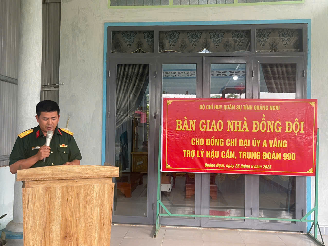Chiều 25/8/2025, tại thôn Măng Rương, xã Kon Đào, Bộ Chỉ huy Quân sự (CHQS) tỉnh Quảng Ngãi tổ chức Lễ bàn giao “Nhà đồng đội” cho đồng chí Đại úy A Vắng – Trợ lý Hậu cần, Trung đoàn 990.