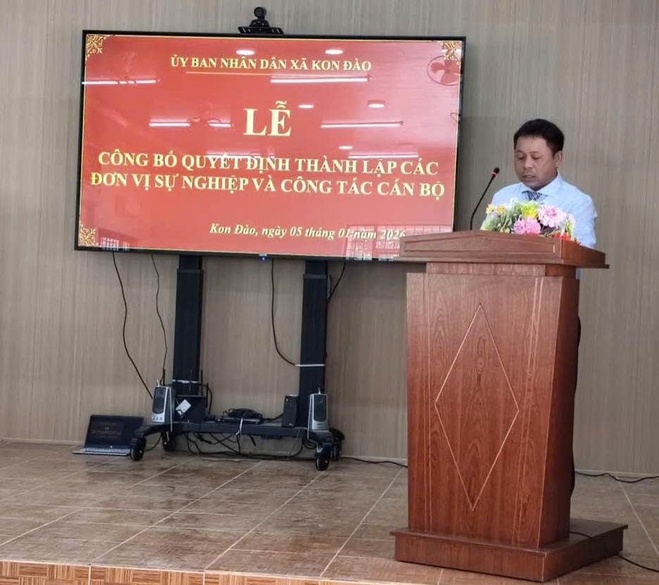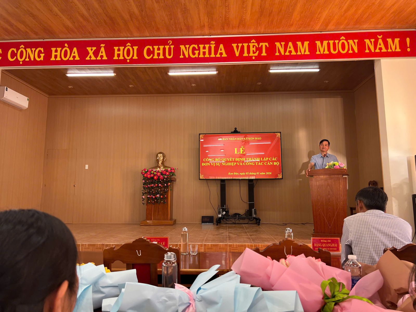 Tại buổi lễ, đồng chí Hoàng Nguyễn Hồng Hoà - Phó Trưởng phòng Văn hóa - Xã hội đã công bố các Quyết định của UBND xã về việc thành lập Trạm Y tế xã Kon Đào và Trung tâm Cung ứng Dịch vụ công xã Kon Đào, đồng thời công bố các Quyết định về công tác cán bộ đối với các đơn vị này.